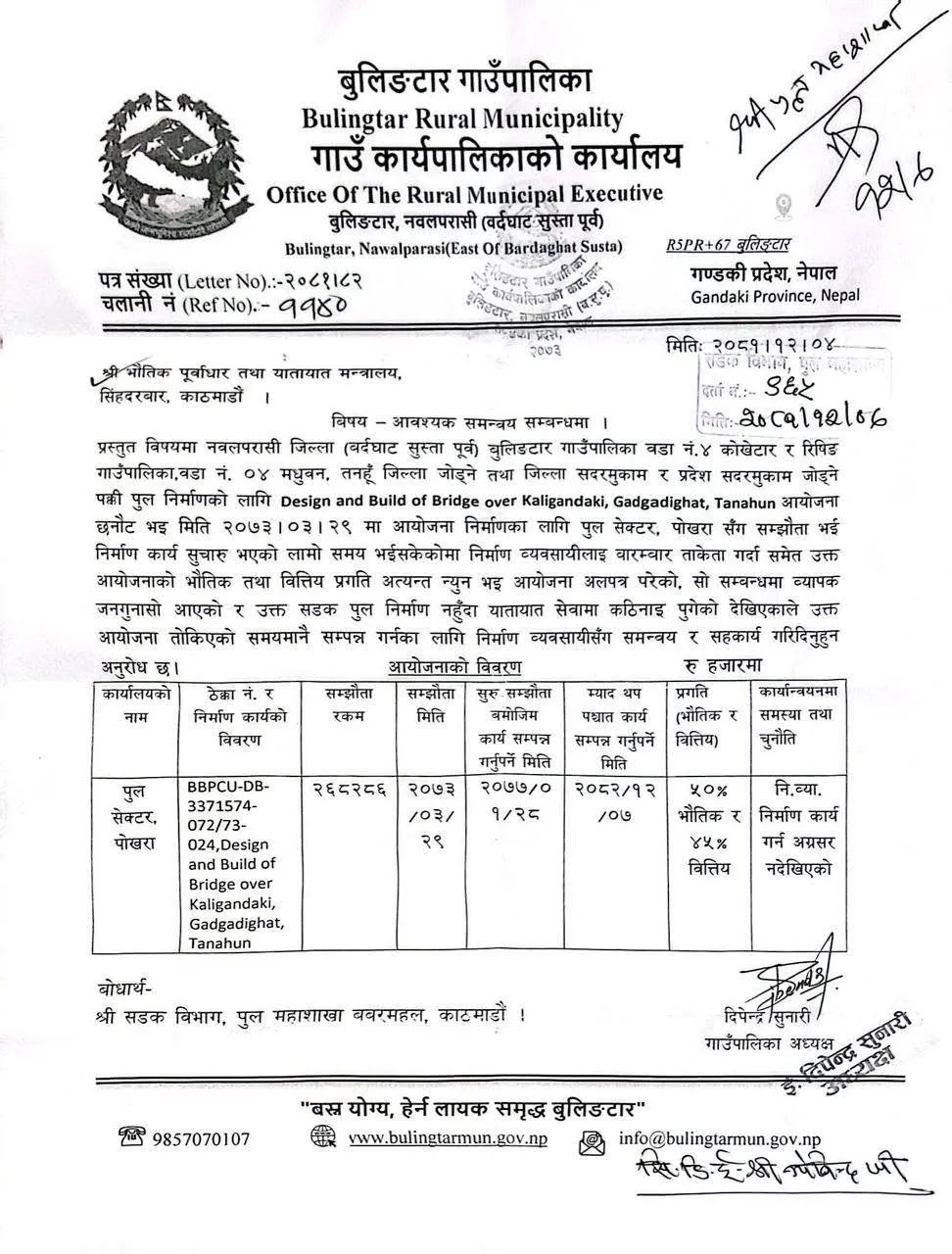 बुलिङटार १३ चैत । नवलपुरको बुलिङटार गाउँपालिका–४ कोखेटार र तनहुँको रिसिङ गाउँपालिका–४ मधुवन जोड्ने पक्की पुल निर्माणमा नौ वर्ष बित्दा पनि काम सम्पन्न नभएपछि बुलिङटार गाउँपालिकाका अध्यक्ष दिपेन्द्र सुनारी मगरको नेतृत्वमा युवा नेता विद्रोही गिरी र स्थानीयहरूले सडक विभागमा गुहार गर्नु भएको छ ।