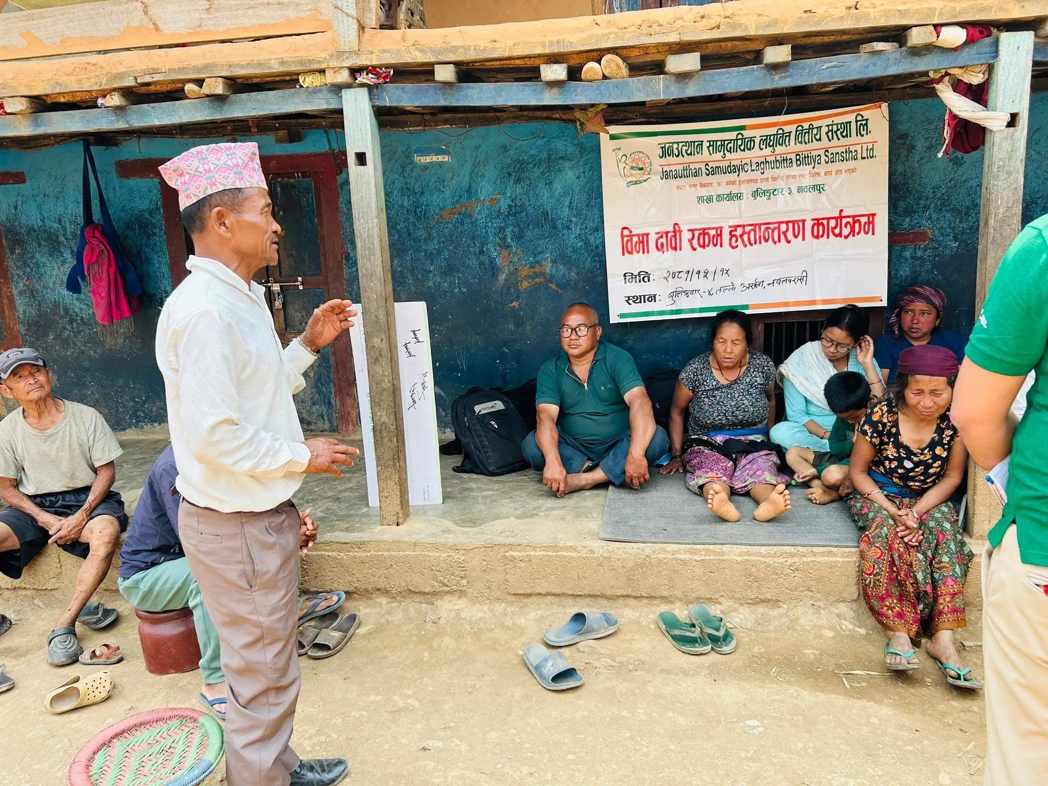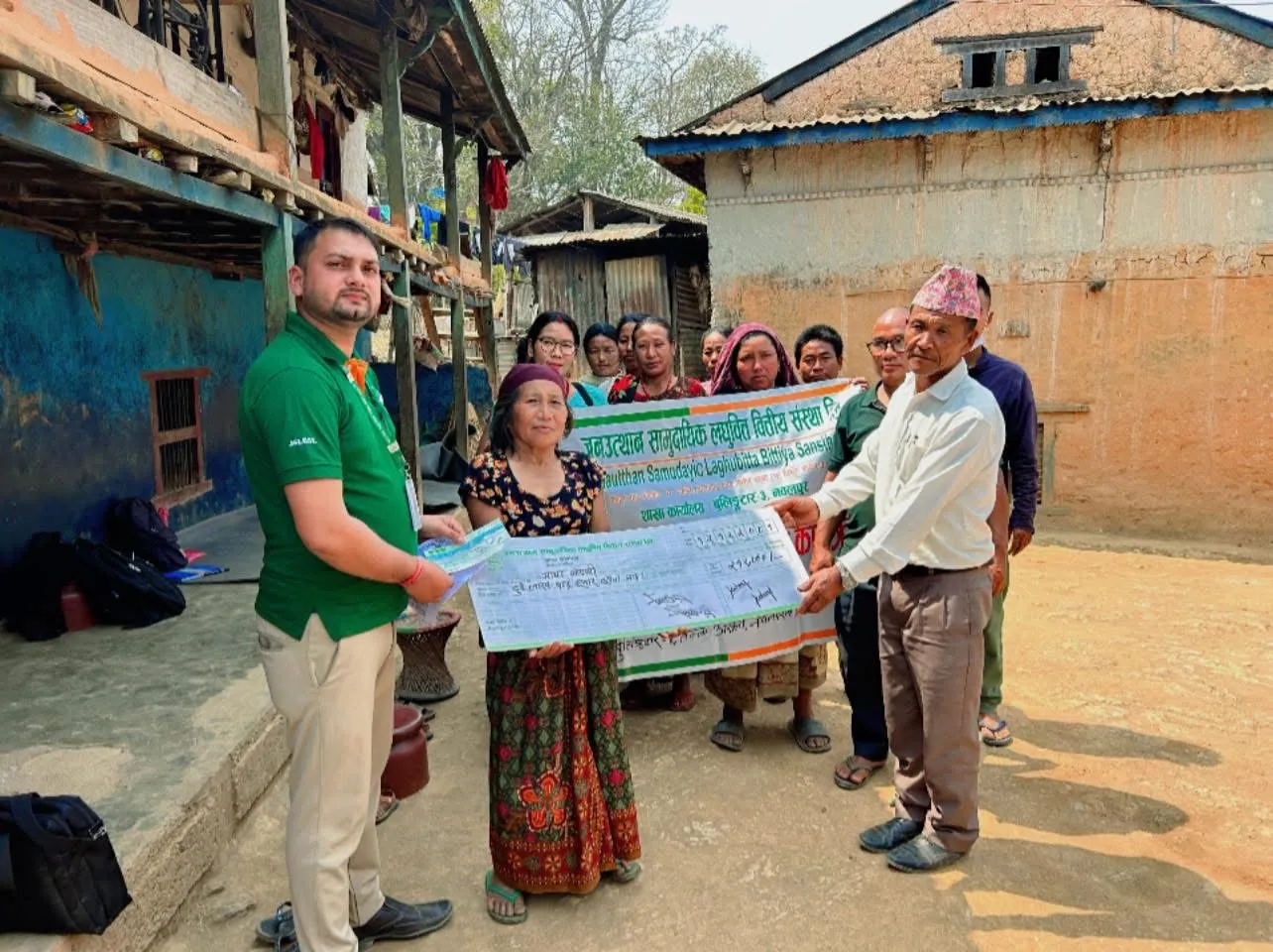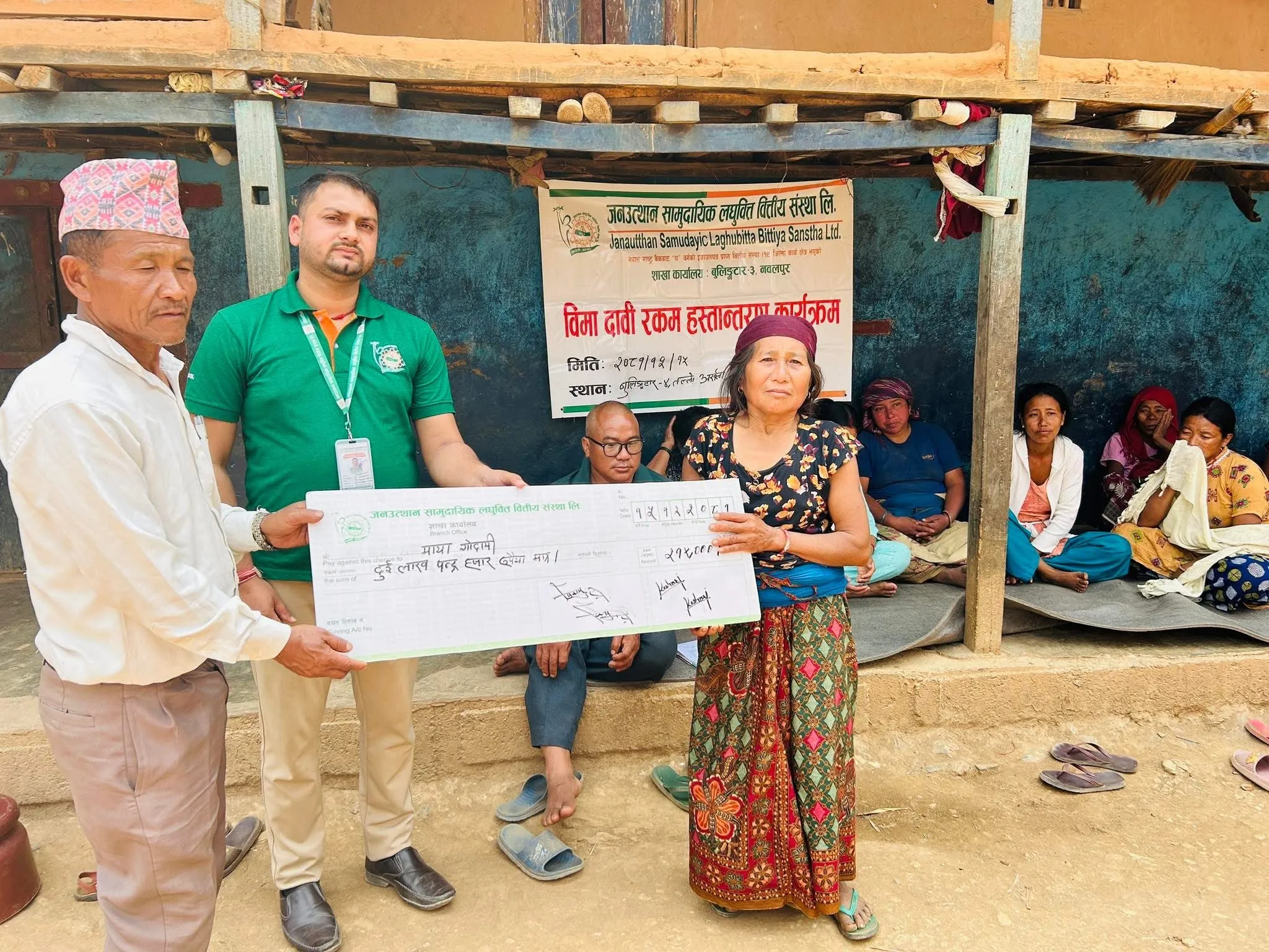 यस जनउत्थान सामुदायिक लघुबित्त वितीय संस्था लि. शाखा कार्यालय बुलिङ्गटार नवलपुर सार्थी जनउत्थान बैकिङ्ग समुदायकी सदस्य माया गोदामि कोश्रीमान बेल बहादुर गोदामी ज्यु को मृत्यु भएको हुनाले निज सदस्य माया गोदामी ज्यु ले लिएको ऋण मिनाहा तथा काज क्रिया खर्च वापत रु २,१५,०००/-(अक्षेरुपि दुई लाख पन्ध्र हजार रुपैया मात्र ) शाखा कार्यालय बुलिङ्गटारका शाखा प्रमुख श्री बिकाश गिरी ,फिल्ड सहायक कर्मचारी श्री मंदिप कुमार यादवकार्यालय सहयोगी हिमा परियार तथा बुलिङ्गटार गाउपालिका वडा न .४ को वडा अध्यक्ष श्री मिन बहादुर आले ज्यु र वडा सदस्य श्री गम बहादुर गोदामी ज्यु(बैकिङ्ग समुदाय प्रमुख) सारथी जनउत्थान बैकिङ्ग समुदाय का सम्पुर्ण सद्स्य ज्युहरु , जनशक्ती जन उत्थान बैकिङ्ग कि प्रमुख, टुल माया सुस्लिङ्ग , सुर्यकिरण जन उत्थान बैकिङ्ग सामुदाय कि प्रमुख पुर्ण माया चिडि , भर भलादमी लगायत सदस्यहरुको रोहवरमा निज ज्यु स्व. बेलबहादुर गोदामी ज्यु कोआत्माको चिर शान्तीको लागी एक मिनेट मौन धारण गरी उहाको आत्माको बैकुण्ठमा बासको कामना गरी सद्स्य माया गोदामी लाई चेक हस्तान्तरण गरियो ।