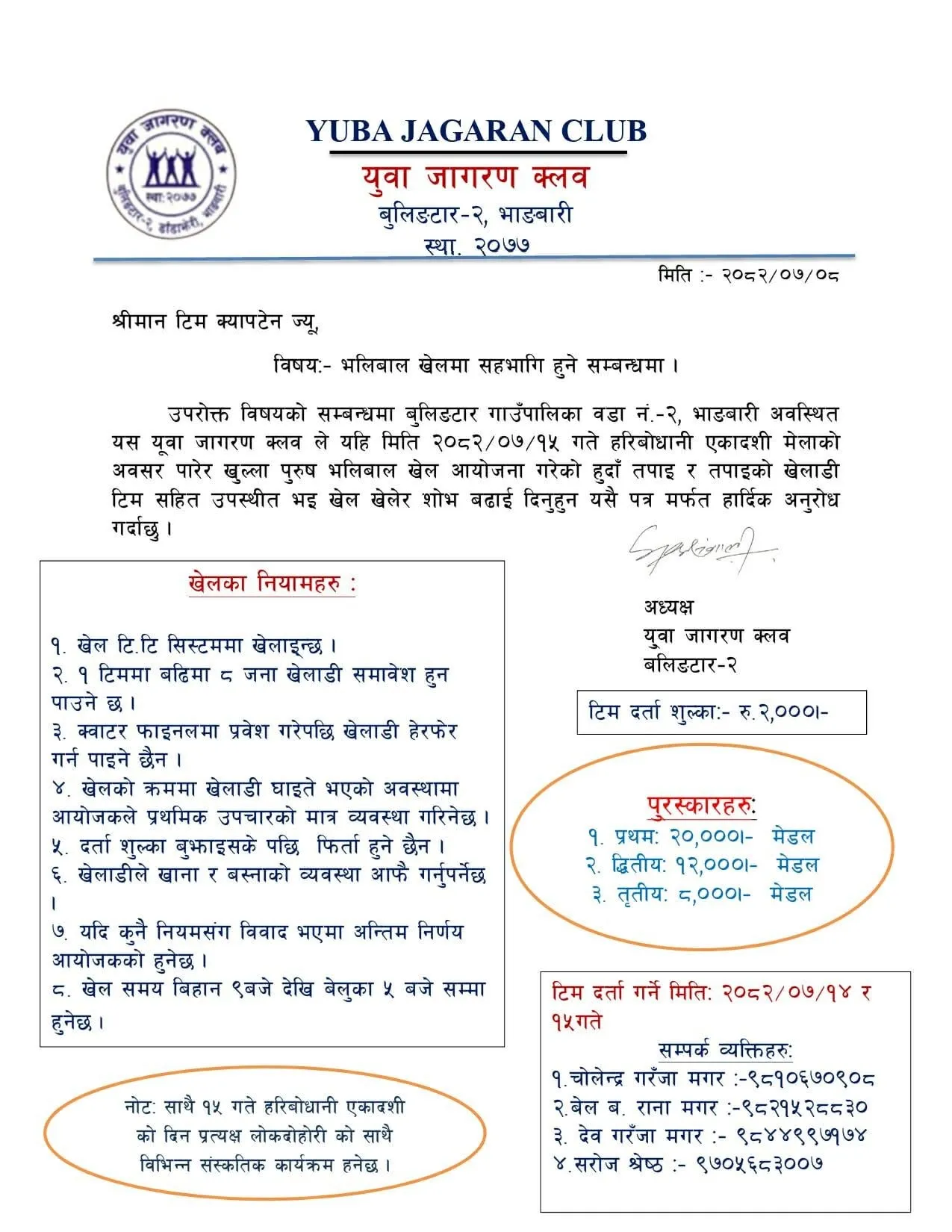 टीम दर्ता गर्ने मिति : २०८२ कार्तिक १४ र १५ गते, दर्ता शुल्क २,००० रुपैयाँ राखिएको आयोजकले बताएको छ ।