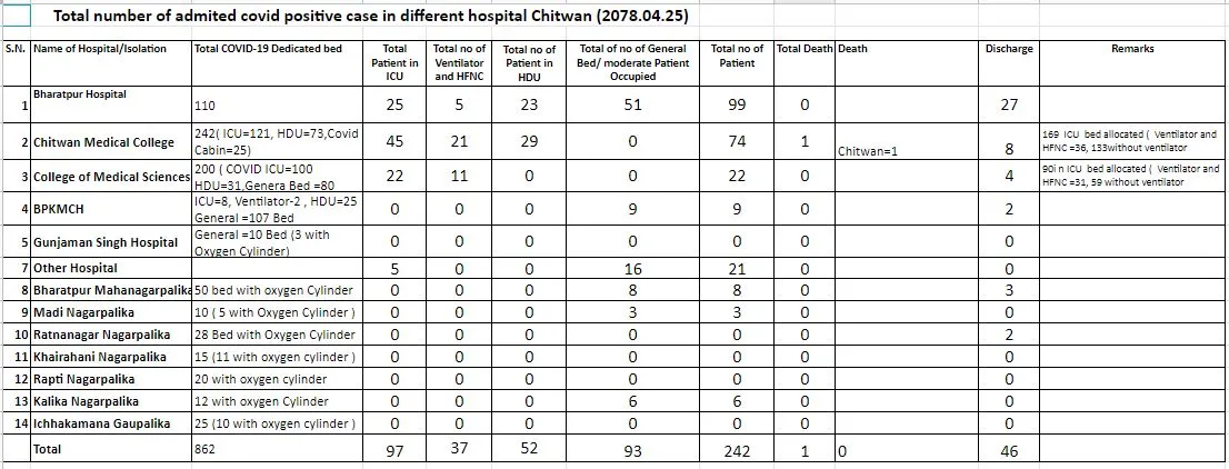 चितवन २५ साउन । आज सम्म चितवनको विभिन्न अस्पतालमा २४२ जना कोरोना संक्रमित बिरामीको उपचार भइरहेको छ ।