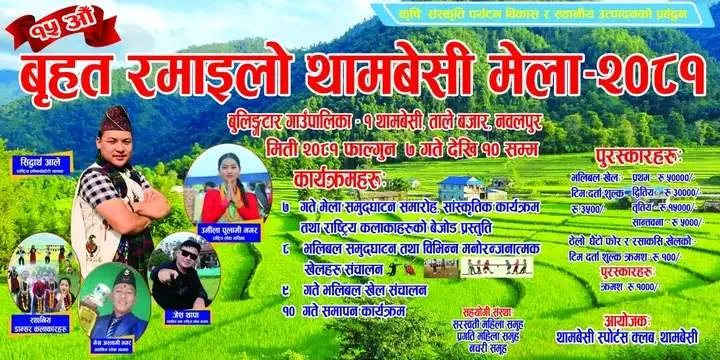 बुलिङ्गटार ६ फागुन । थामबेसीमा १५औं बृहत रमाइलो थामबेसी मेला-२०८१ भोलि देखि हुने भएको छ । थामबेसी स्पोर्टस क्लब थामबेसीको आयोजनामा बुलिङ्गटार गाउँपालिका १ थामबेसी, ताले बजारमा मिती २०८१ फाल्गुन ७ गते देखि १० सम्म विभिन्न कार्यक्रमहरु गरी गर्ने भएको छ । कार्यक्रमहरु ७ गते मेला समुद्घाटन समारोह सांस्कृतिक कार्यक्रम तथा राष्ट्रिय कलाकाहरुको बेजोड प्रस्तुति […]