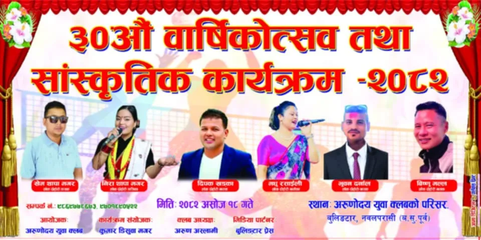 बुलिङ्टार ०९ असोज । कला र संस्कृतिको संरक्षण, कृषि पर्यटन, उद्योग तथा व्यापार प्रबर्धन भने मुलानारा साथ श्री अरुणोदय युवा क्लब बुलिङ्टार-१, ढाडबेसीले ३० औं वार्षिकोत्सव तथा सांस्कृतिक कार्यक्रम र बडा स्तरीय भलिबल खेल प्रतियोगिता उद्घाटन भव्य रुपमा मनाउने भएको छ । नवलपुर बुलिङटार गाउँपालिका वडा नं. १, ढाँडबेसीमा सञ्चालित श्री अरुणोदय युवा क्लबको ३०वार्षिकोत्सवको […]