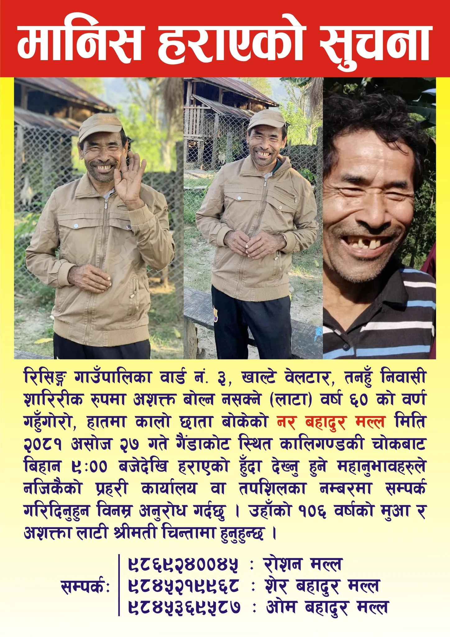 तनहुँ ०५ कार्तिक । रिसिङ्ग गाउँपालिका वार्ड नं. ३, खाल्टे वेलटार, तनहुँ निवासी शारिरीक रुपमा अशक्त बोल्न नसक्ने (लाटा) वर्ष ६० को वर्ण गहुँगोरो, हातमा कालो छाता बोकेको नर बहादुर मल्ल मिति २०८१ असोज २७ गते गैंडाकोट स्थित कालिगण्डकी चोकबाट बिहान ५:०० बजेदेखि हराएको हुँदा देख्नु हुने महानुभावहरुले नजिकैको प्रहरी कार्यालय वा तपशिलका नम्बरमा सम्पर्क […]