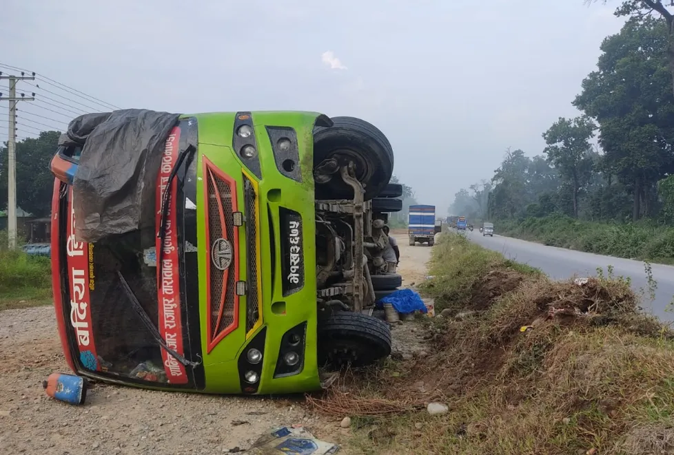 बर्दियाबाट काठमान्डौ जादै गरेको नाइटबस गैँडाकोटमा दुर्घटना २ जना घाइते
