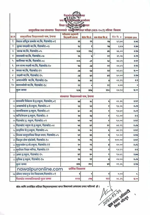 गैंडाकोट १५ असार । नवलपुरको गैंडाकोट नगरपालिका वडा नं. १८ मा रहेको बालज्योति माध्यामिक विद्यालयबाट २०८१ को एसइई परिक्षामा सामेल भएका ११ जना विद्यार्थीमा सबैजना फेल भएका छन् । गैंडाकोट १८ स्थित दमारमा रहेको उक्त विद्यालयबाट सहभागी ११ जना विद्यार्थीमा सबैजनाको ननग्रेडेड नतिजा आएको गैंडाकोट नगरपालिकाका शिक्षा अधिकृत राम प्रसाद अधिकारीले जानकारी दिनुभयो।